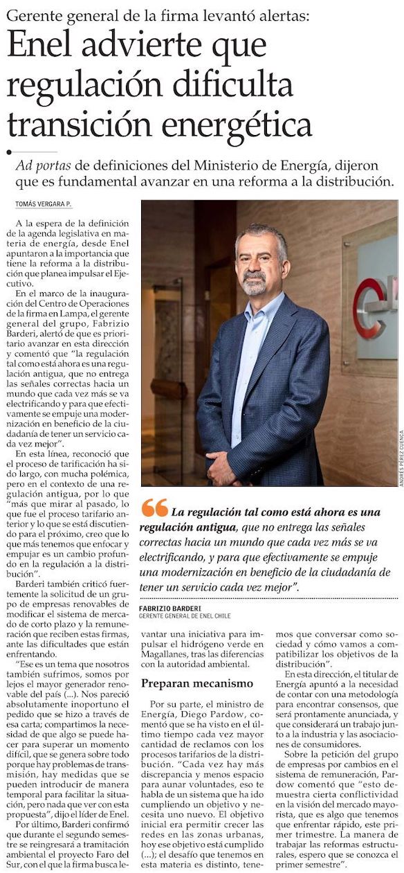 Enel y propuesta de un grupo de firmas para modificar la tarificación de las renovables: "Nos pareció absolutamente inoportuno" - (Diario Financiero)