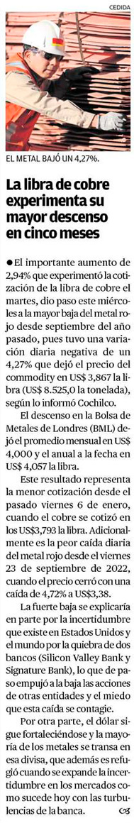 Precio del cobre cae por temores en la banca y datos provenientes de China y Estados Unidos - (El Mercurio de Santiago)