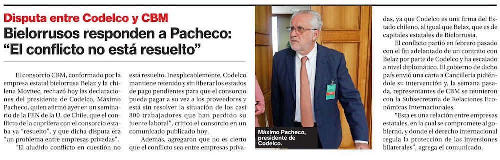 Firma bielorrusa descarta que conflicto con Codelco esté resuelto y dice que "compromete" al gobierno de Chile - (emol)
