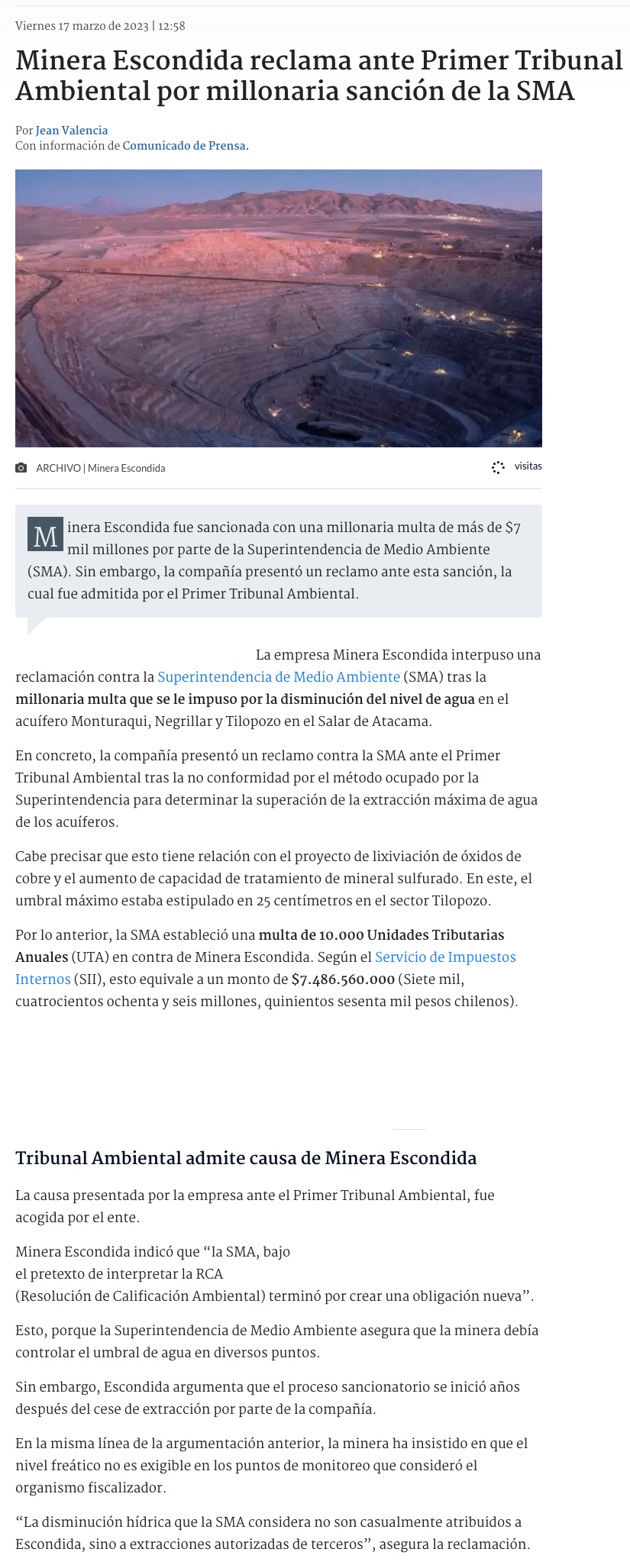 Minera Escondida reclama contra la SMA - (El Mercurio de Santiago)