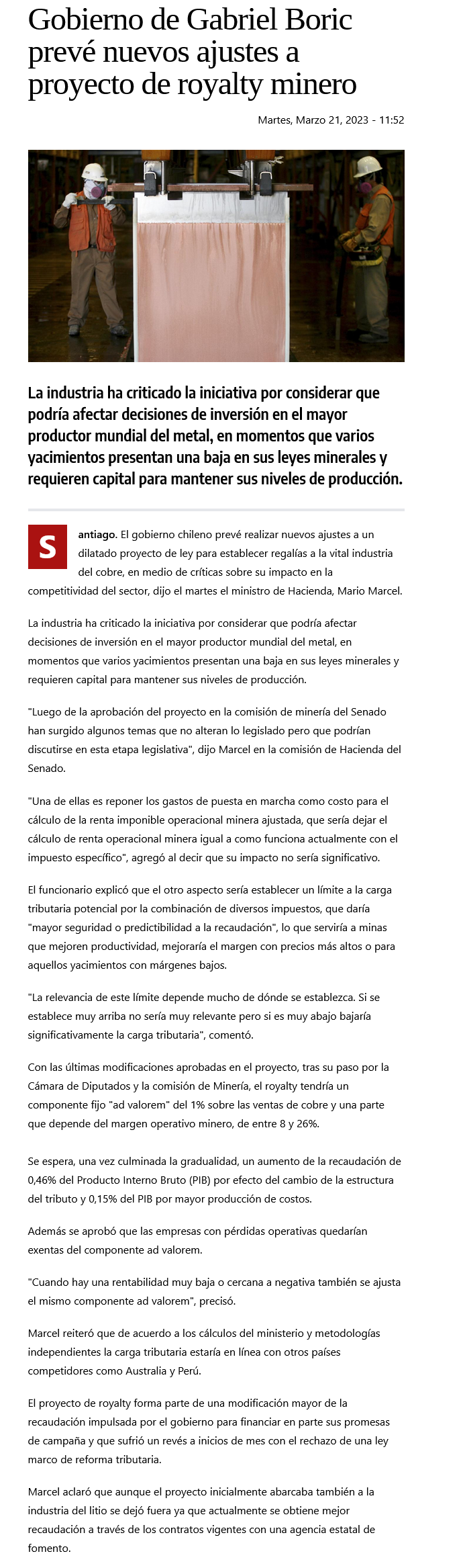 Gobierno se abre a cambios en royalty y anuncia límite a la tributación de las empresas mineras - (El Mercurio de Santiago)