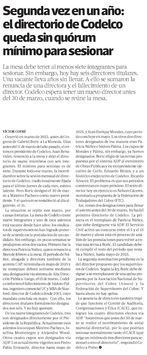 Imposibilidad del directorio de Codelco para sesionar pone presión sobre el Gobierno - (El Mercurio de Santiago)