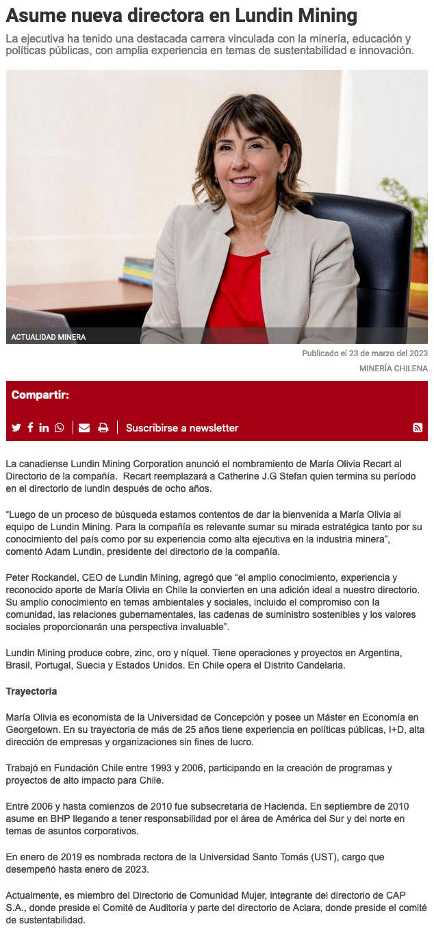 María Olivia Recart asume como directora de Lundin Mining - (Diario Financiero)