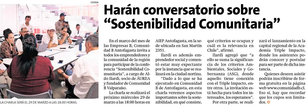 Comunidad B Antofagasta dictará nueva charla sobre "Sostenibilidad Comunitaria" - (El Mercurio de Antofagasta)
