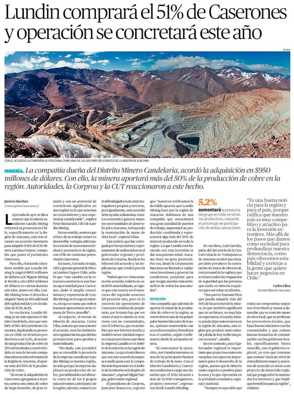 Tras acuerdo para adquirir Caserones, Lundin Mining estudiará posible ampliación de planta desaladora en Caldera - (Pulso)