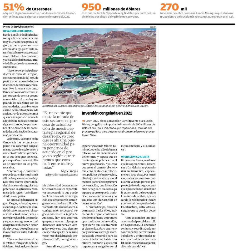 Lundin Mining busca crear uno de los distritos mineros más importantes del país - (El Mercurio de Santiago)