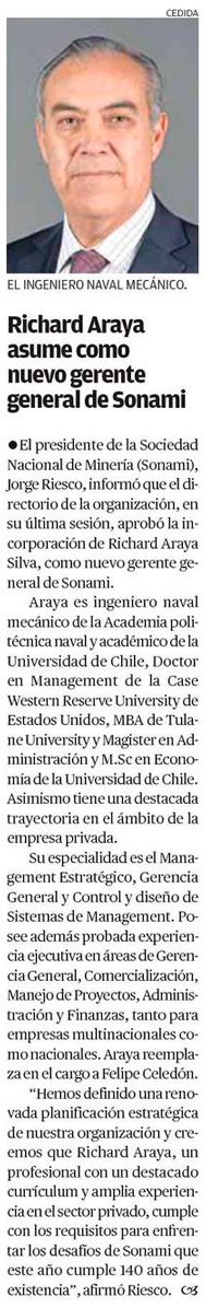 Sonami nombra a Richard Araya Silva como nuevo gerente general - (El Mercurio de Santiago)