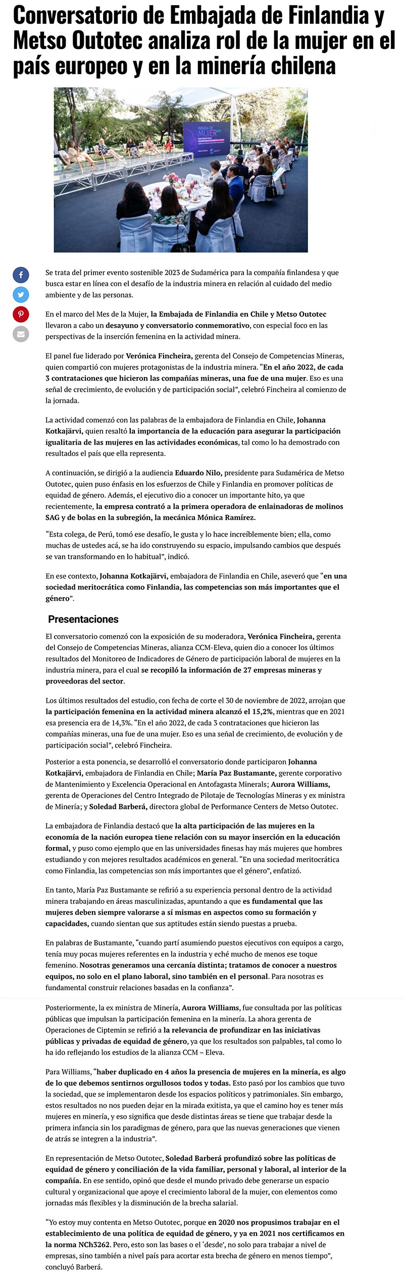 Conversatorio de Embajada de Finlandia y Metso Outotec analiza rol de la mujer en el país europeo y en la minería chilena - (mch.cl)