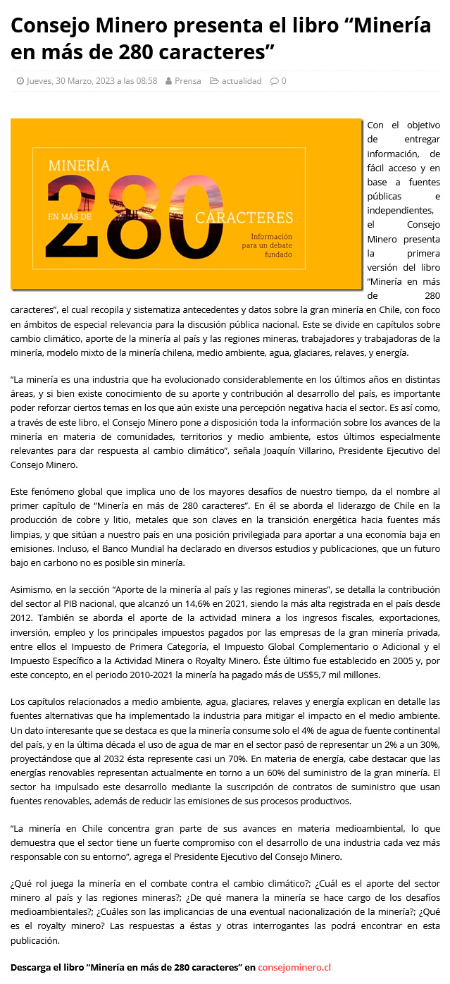 Consejo Minero presenta el libro “Minería en más de 280 caracteres” - (nuevaminería online)