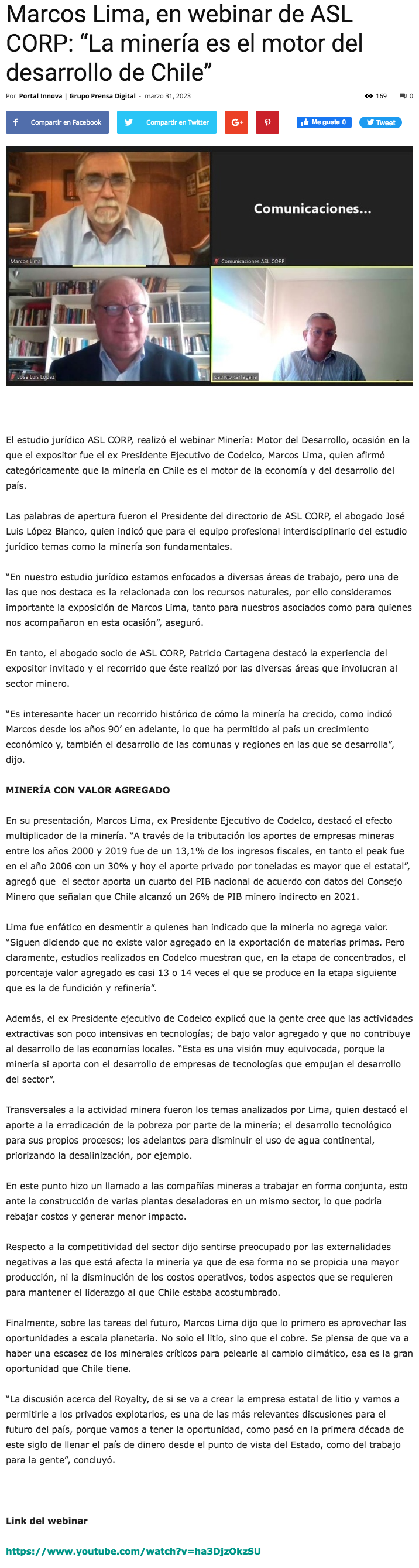 Marcos Lima en webinar de ASL Corp: “La minería es el motor del desarrollo de Chile” - (portalminero)