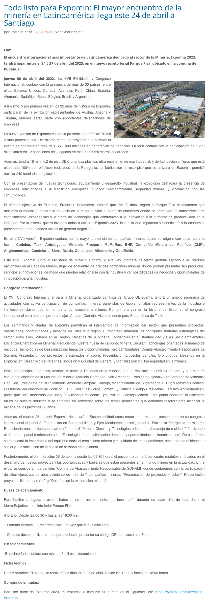 Todo preparado para Expomin: el mayor encuentro de la minería en Latinoamérica llega este 24 de abril a Santiago - (portalinnova.cl)
