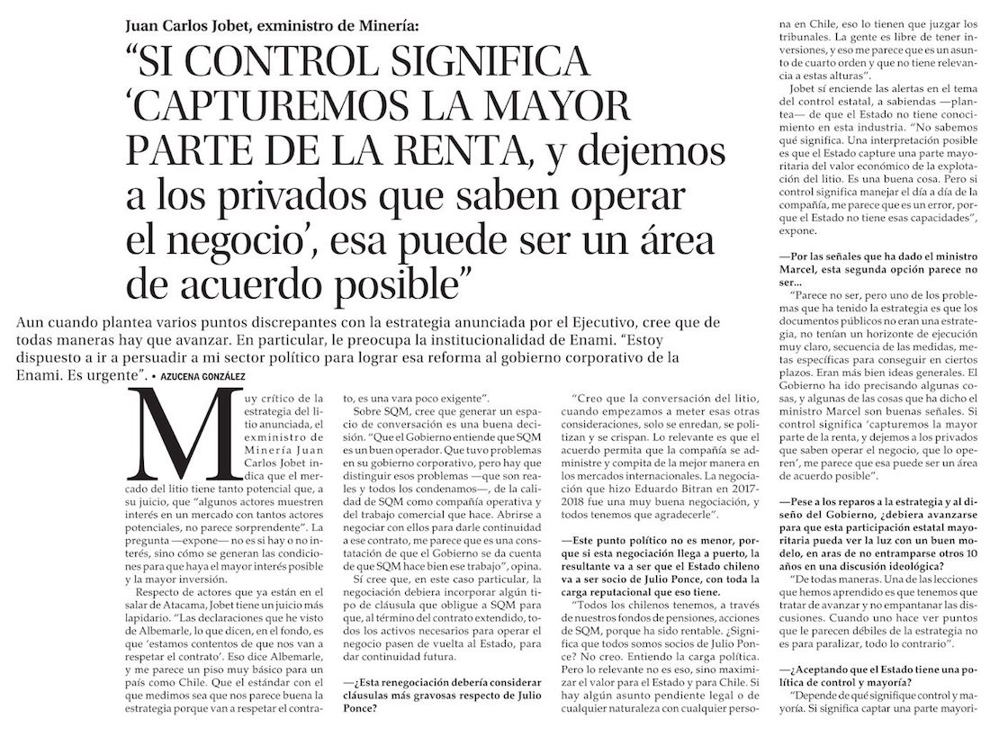 Felipe Sandoval, exvicepresidente de Corfo: “Creo en una cosa más parecida a una concesión, arriendos (…) Pero hay que tomar en cuenta la realidad que tenemos de lo que es posible" - (El Mercurio de Santiago)