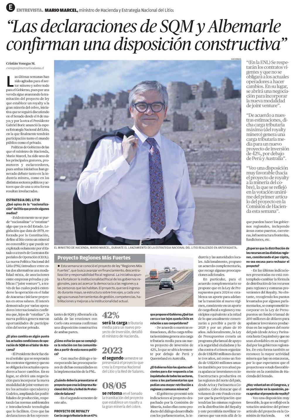 "Las declaraciones de SQM y Albemarle confirman una disposición constructiva" - (El Mercurio de Antofagasta)