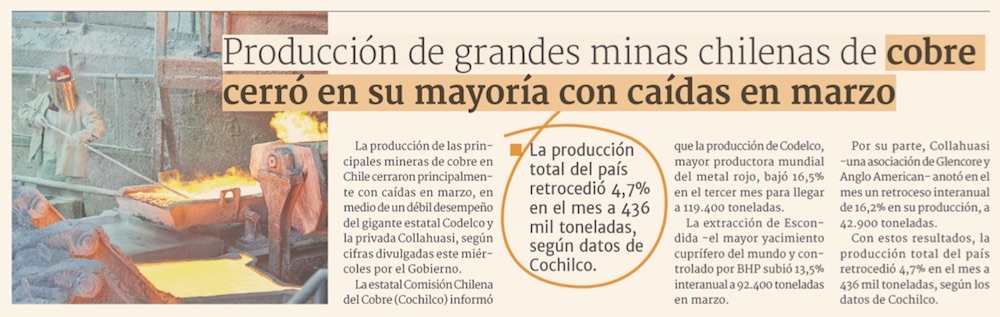 Aporte de las mineras privadas al fisco se desploma 45% durante el último año - (El Mercurio de Santiago)