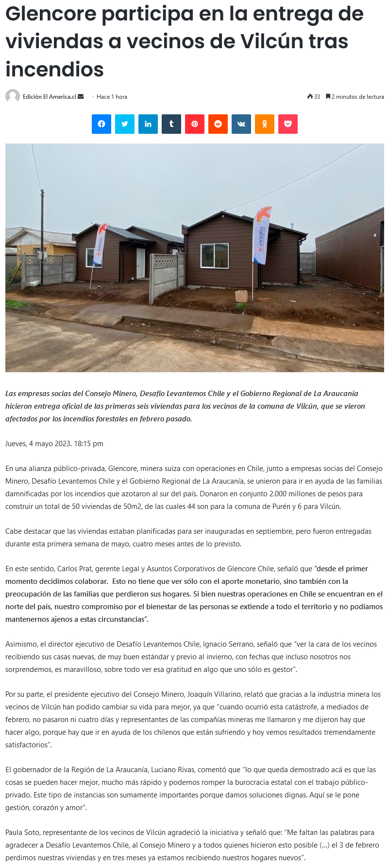 Glencore participa en la entrega de viviendas a vecinos de Vilcún tras incendios - (eldiariosantiago.cl)