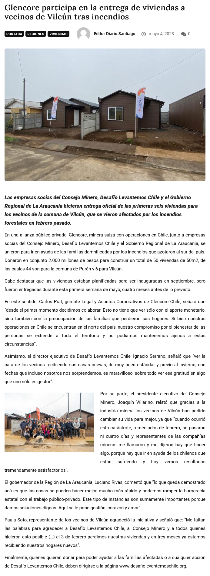 Glencore participa en la entrega de viviendas a vecinos de Vilcún tras incendios - (mediabanco.com)