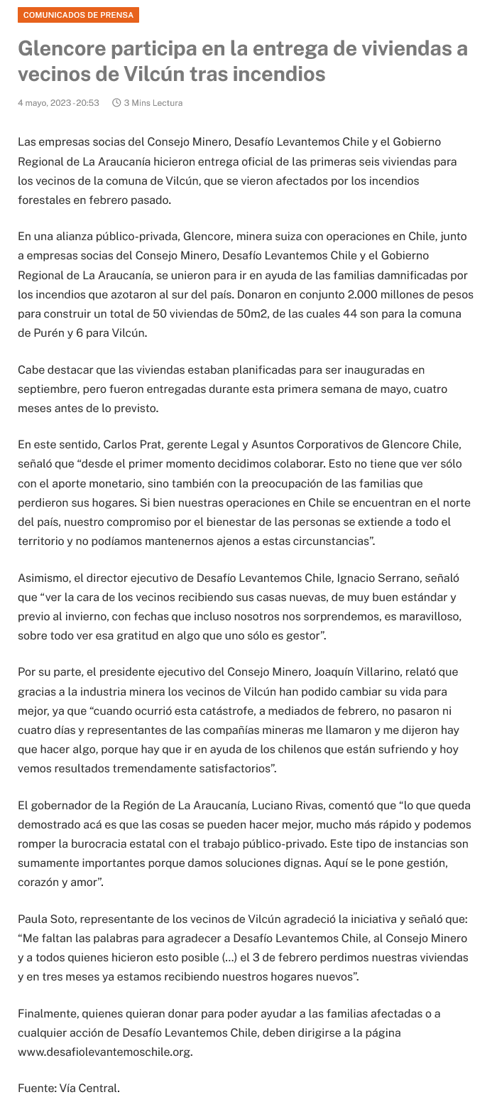 Glencore participa en la entrega de viviendas a vecinos de Vilcún tras incendios - (eldiariosantiago.cl)
