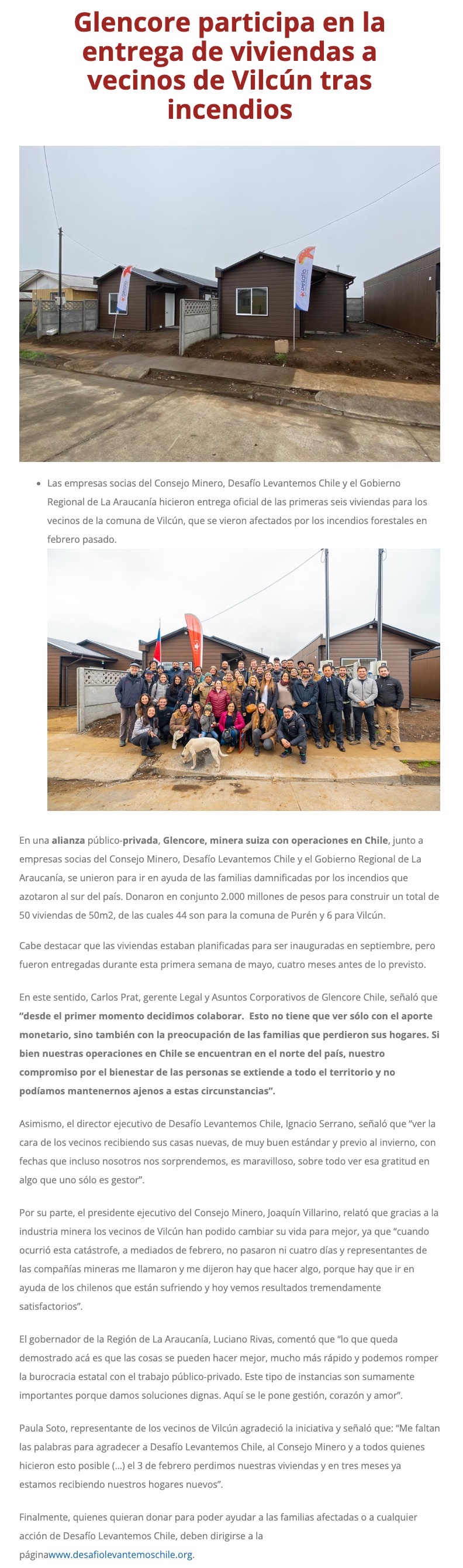 Glencore participa en la entrega de viviendas a vecinos de Vilcún tras incendios - (mediabanco.com)