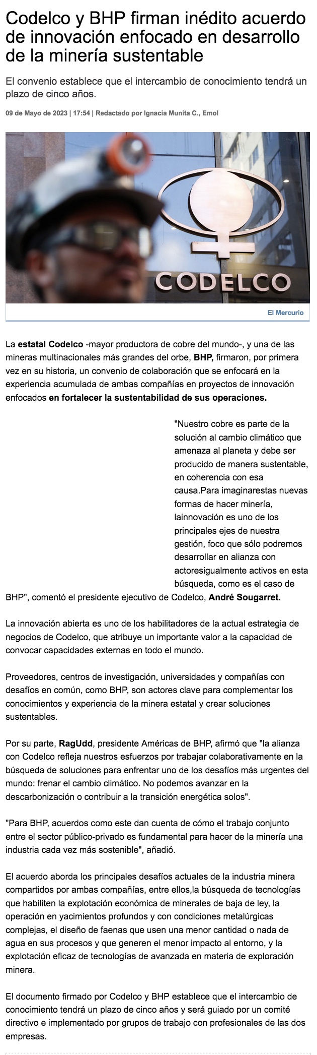 Codelco y BHP firman acuerdo de innovación en minería sustentable - (El Mercurio de Antofagasta)