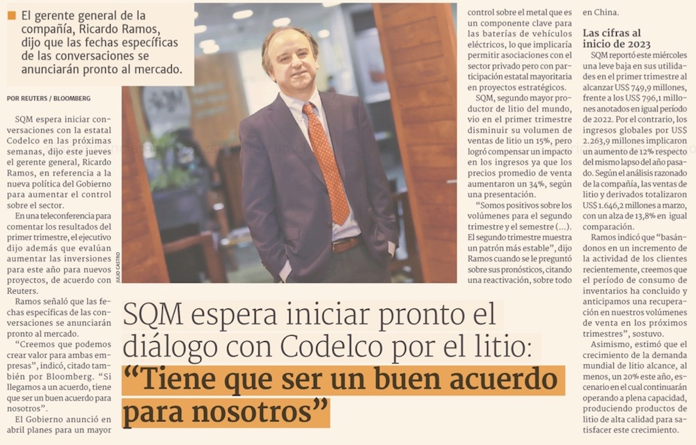 SQM se pone plazos para negociación con Codelco y ve nuevos proyectos incluso en Chile - (El Mercurio de Santiago)