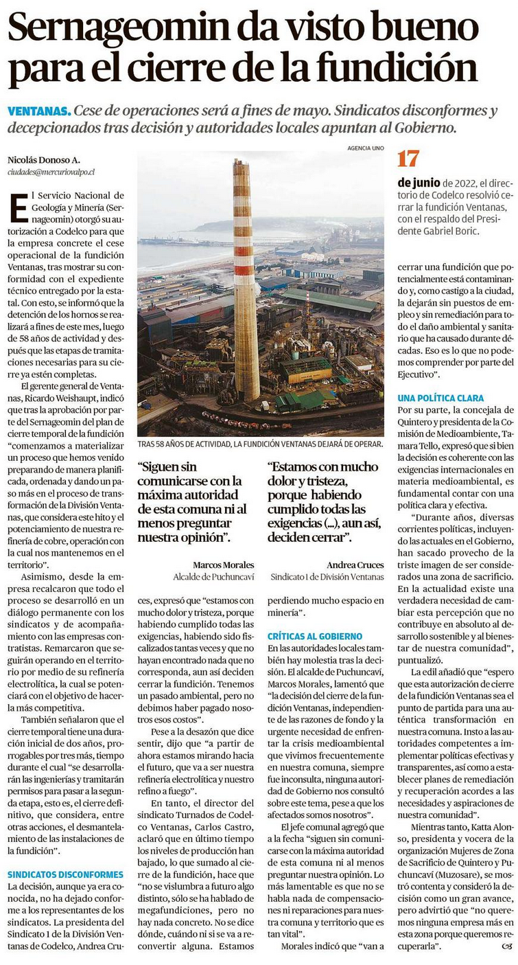 Sernageomin autoriza cierre de fundición Ventanas a fin de mes - (Pulso)