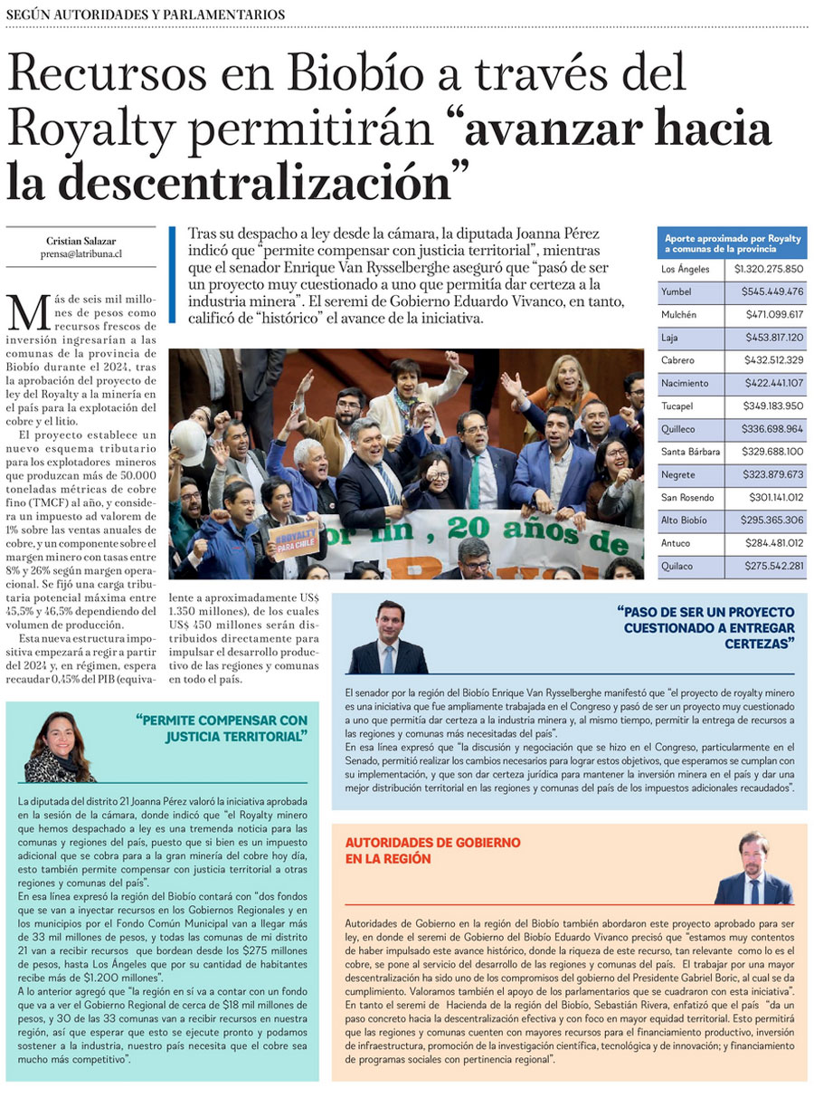 Royalty Minero: Congresistas destacan la distribución de recursos para el desarrollo regional - (Diario Concepción)