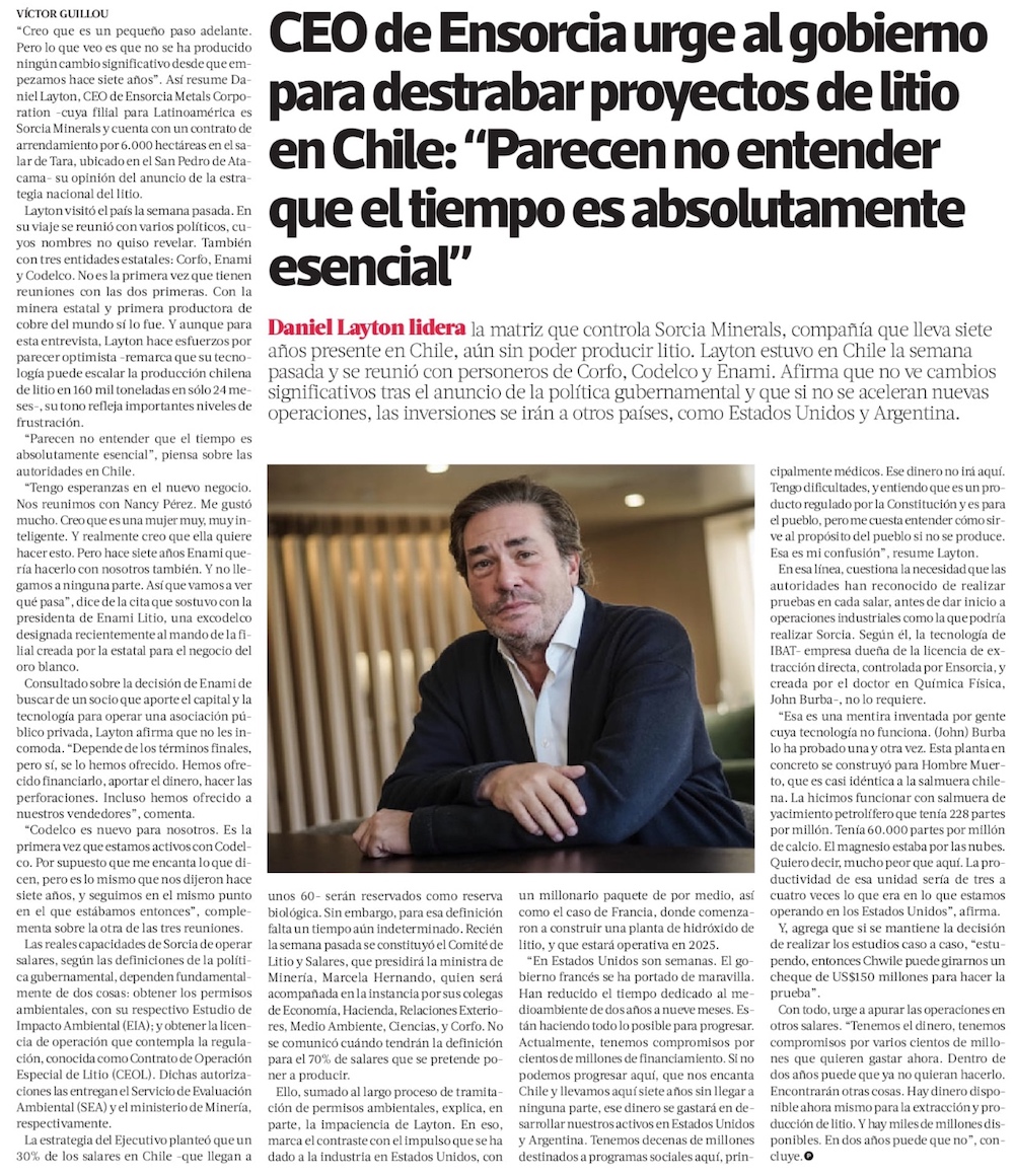 Sorcia Minerals y el litio: “Empezamos a ver instituciones financieras renuentes porque no creen que Chile se abra” - (Diario Financiero)