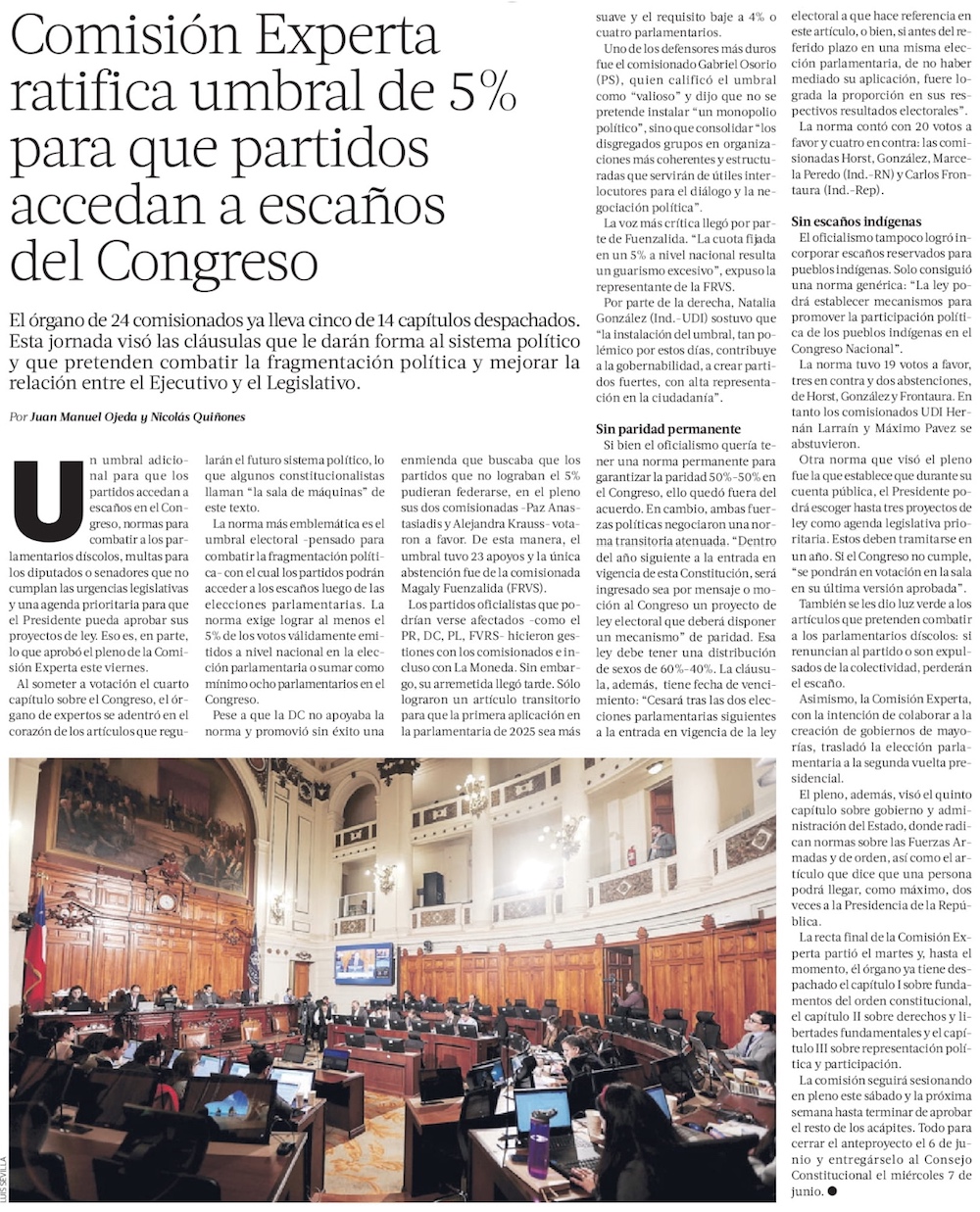 Comisión Experta ratifica umbral de 5% para partidos en el Congreso y aprueba paridad de salida transitoria - (El Mercurio de Santiago)