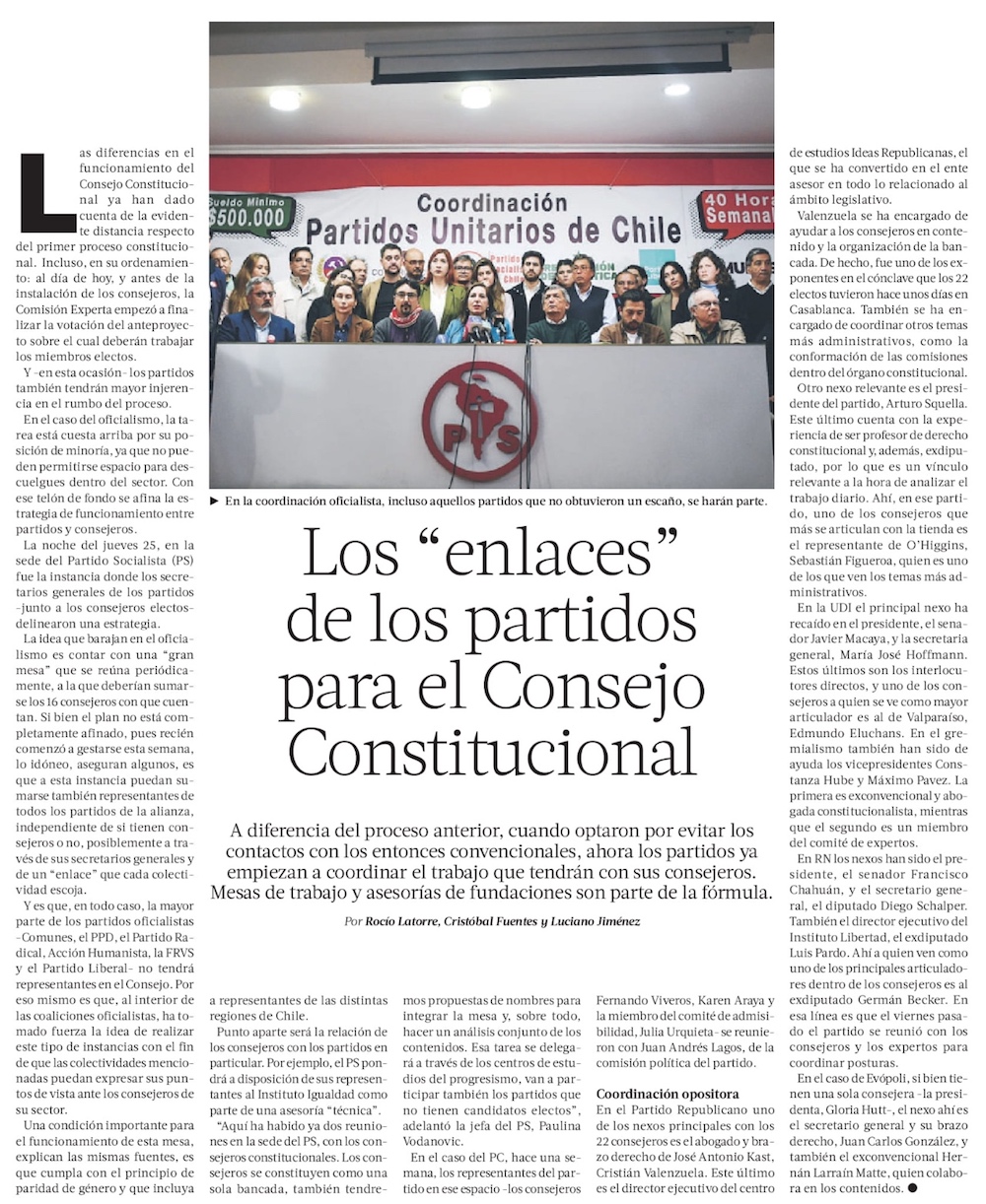 Comisión Experta ratifica umbral de 5% para partidos en el Congreso y aprueba paridad de salida transitoria - (El Mercurio de Santiago)