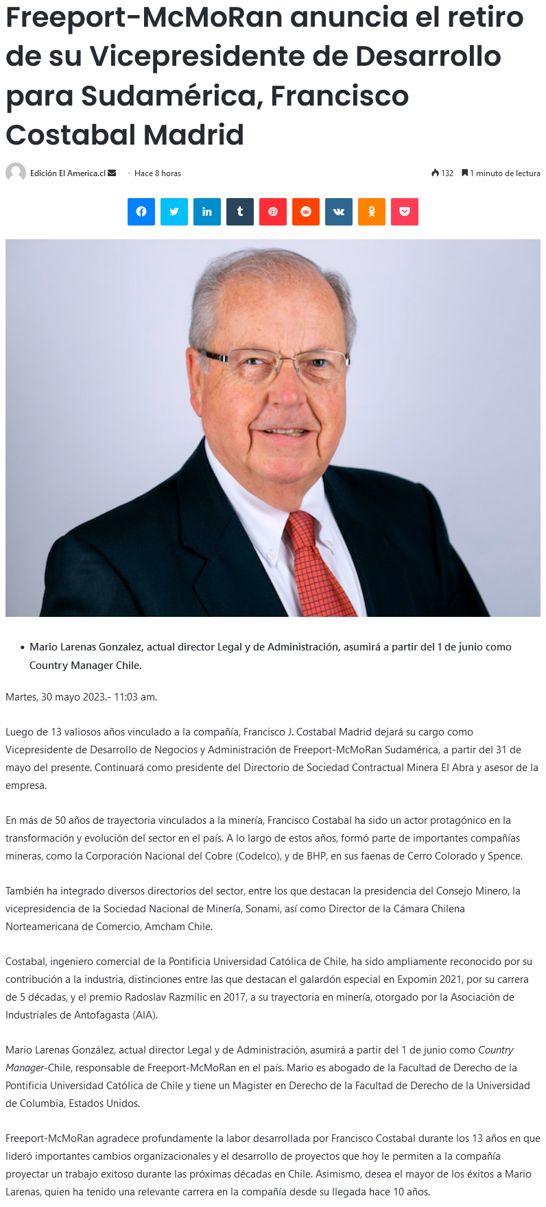 Freeport- McMoran anuncia el retiro de su Vicepresidente de Desarrollo para Sudamérica, Francisco Costabal Madrid - (Nostálgica Online)