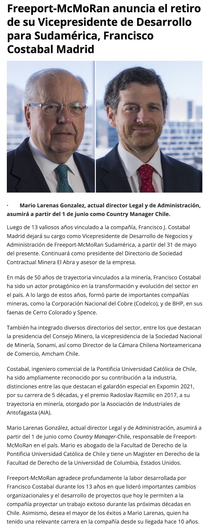 Freeport-McMoRan anuncia el retiro de su Vicepresidente de Desarrollo para Sudamérica, Francisco Costabal Madrid - (elamerica)