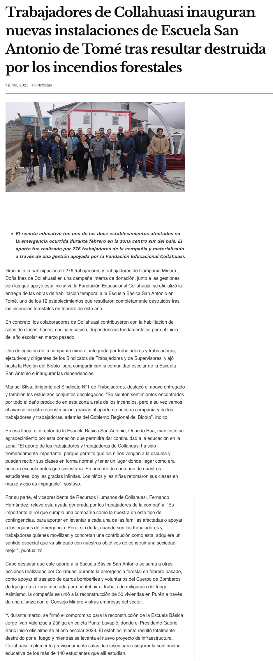 Trabajadores de Collahuasi inauguran nuevas instalaciones de Escuela en Tomé tras resultar destruida por los incendios forestales - (cualestuhuella.cl)