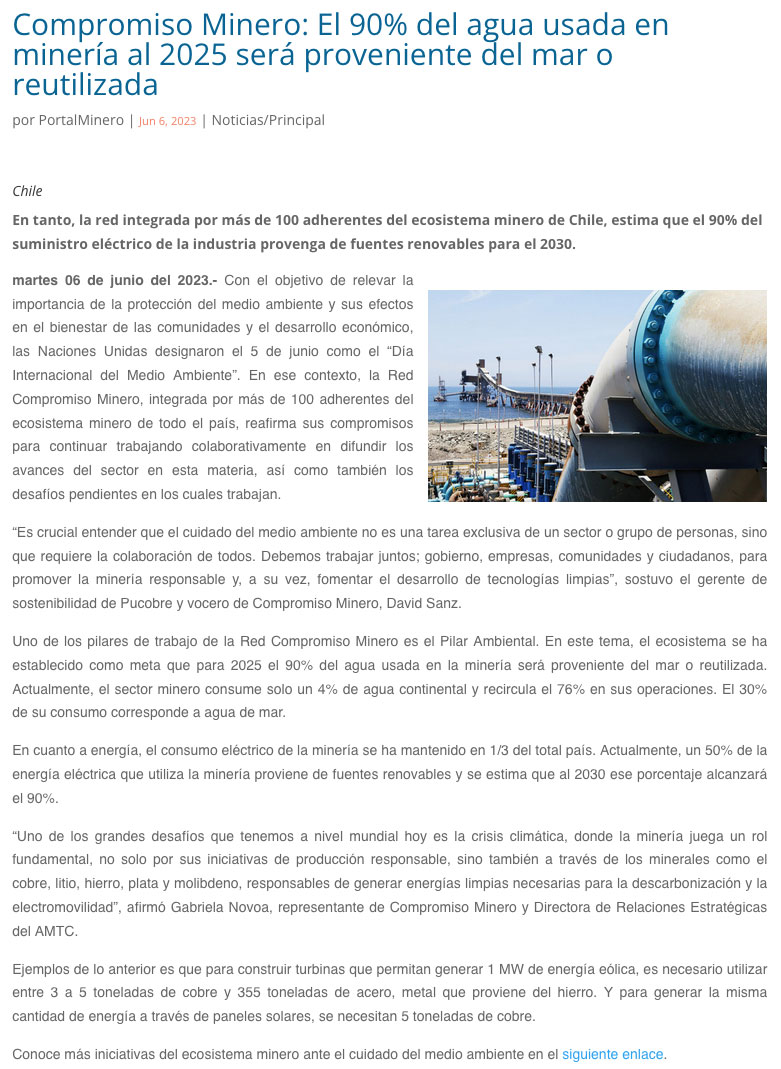 Día Internacional del Medio Ambiente: Compromiso Minero destaca avances del sector en la materia - (mch.cl)