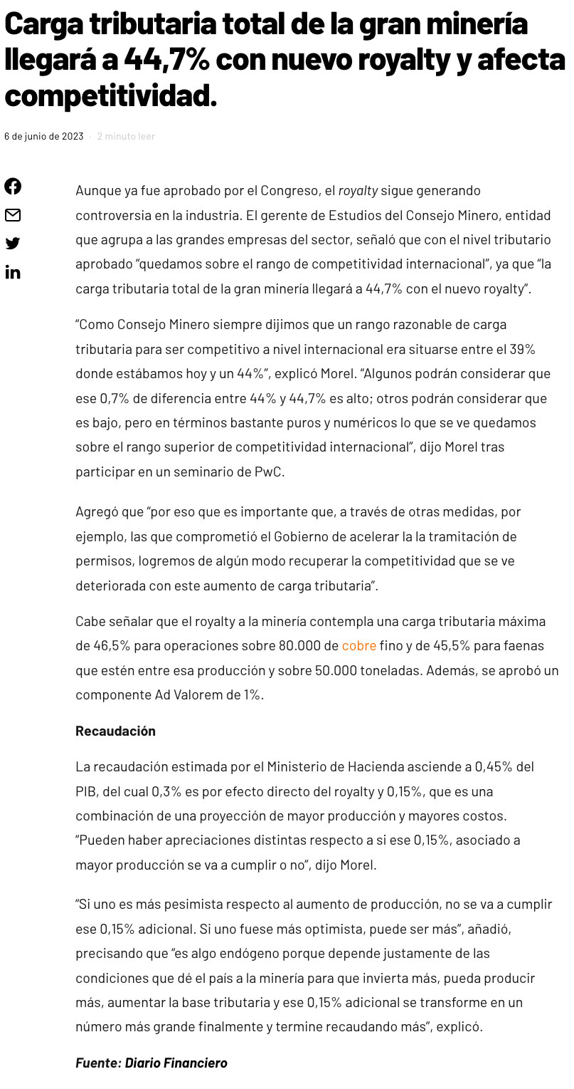 Carga tributaria total de la gran minería llegará a 44,7% con nuevo royalty de acuerdo al Consejo Minero - (nuevaminería online)