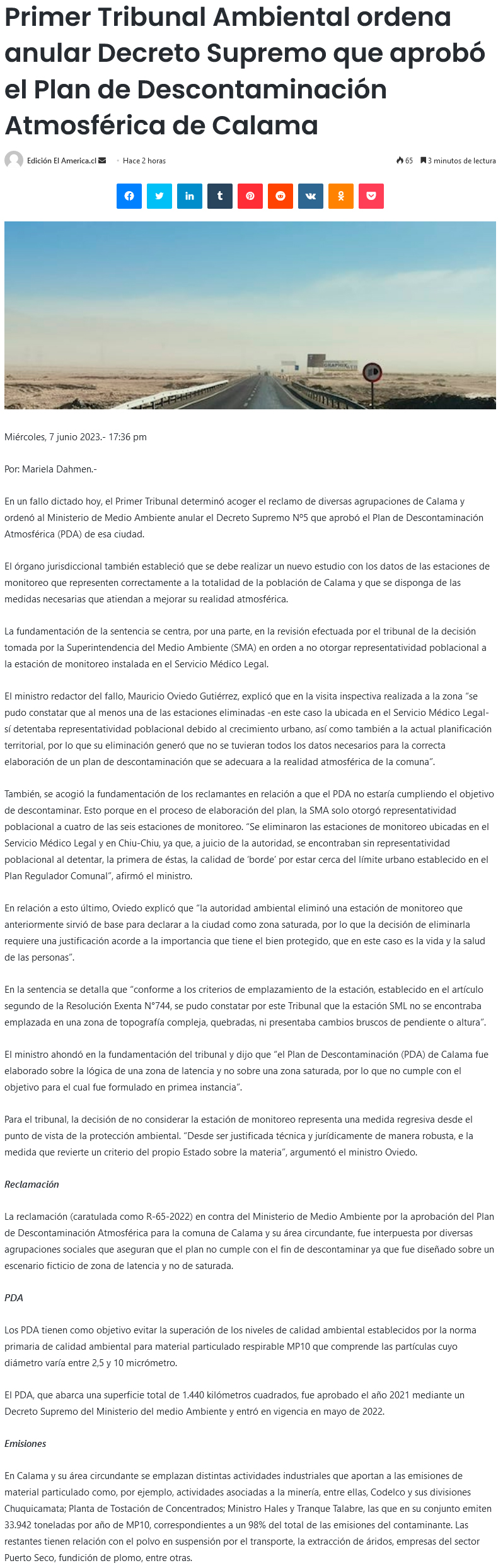 El Primer Tribunal Ambiental anuló el Plan de Descontaminación Atmosférica - (El Mercurio de Calama)