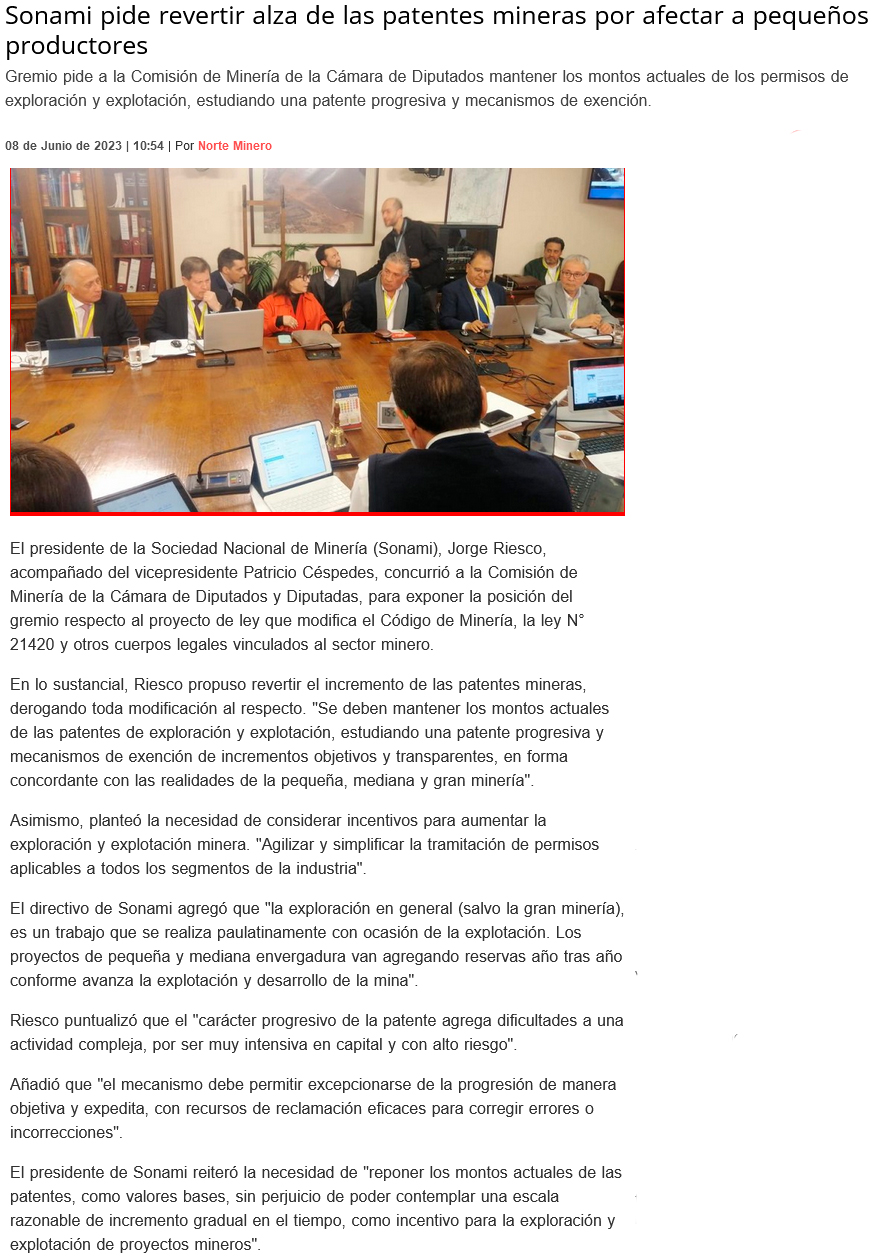 Sonami propuso revertir alza de las patentes mineras en la Cámara - (El Mercurio de Antofagasta)