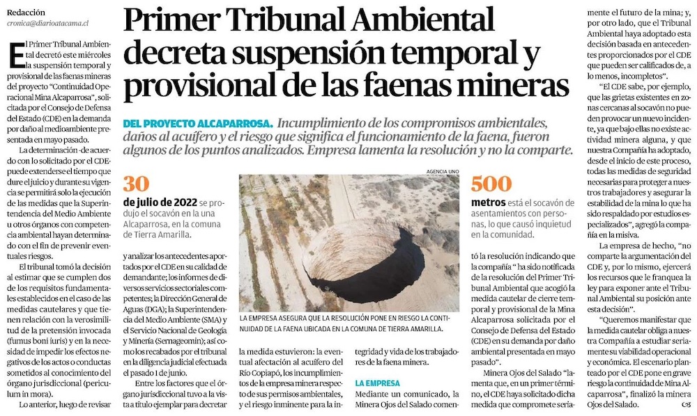 Decretan suspensión de Minera Alcaparrosa - (El Mercurio de Santiago)