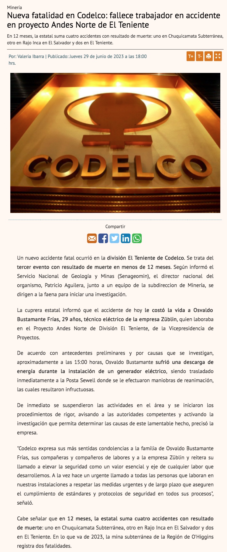 Codelco reporta muerte de trabajador en El Teniente: se trata del cuarto fallecimiento en últimos 12 meses - (Pulso)