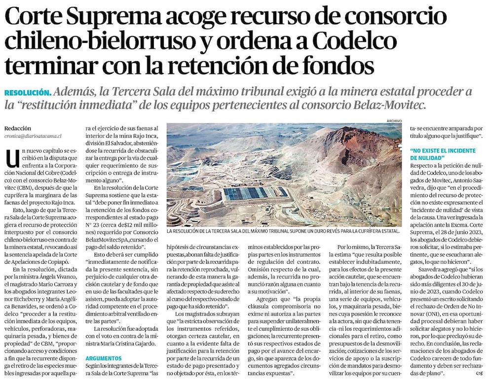 Suprema ordena a Codelco devolver máquinas y dineros retenidos pertenecientes a consorcio bielorruso - (biobiochile online)