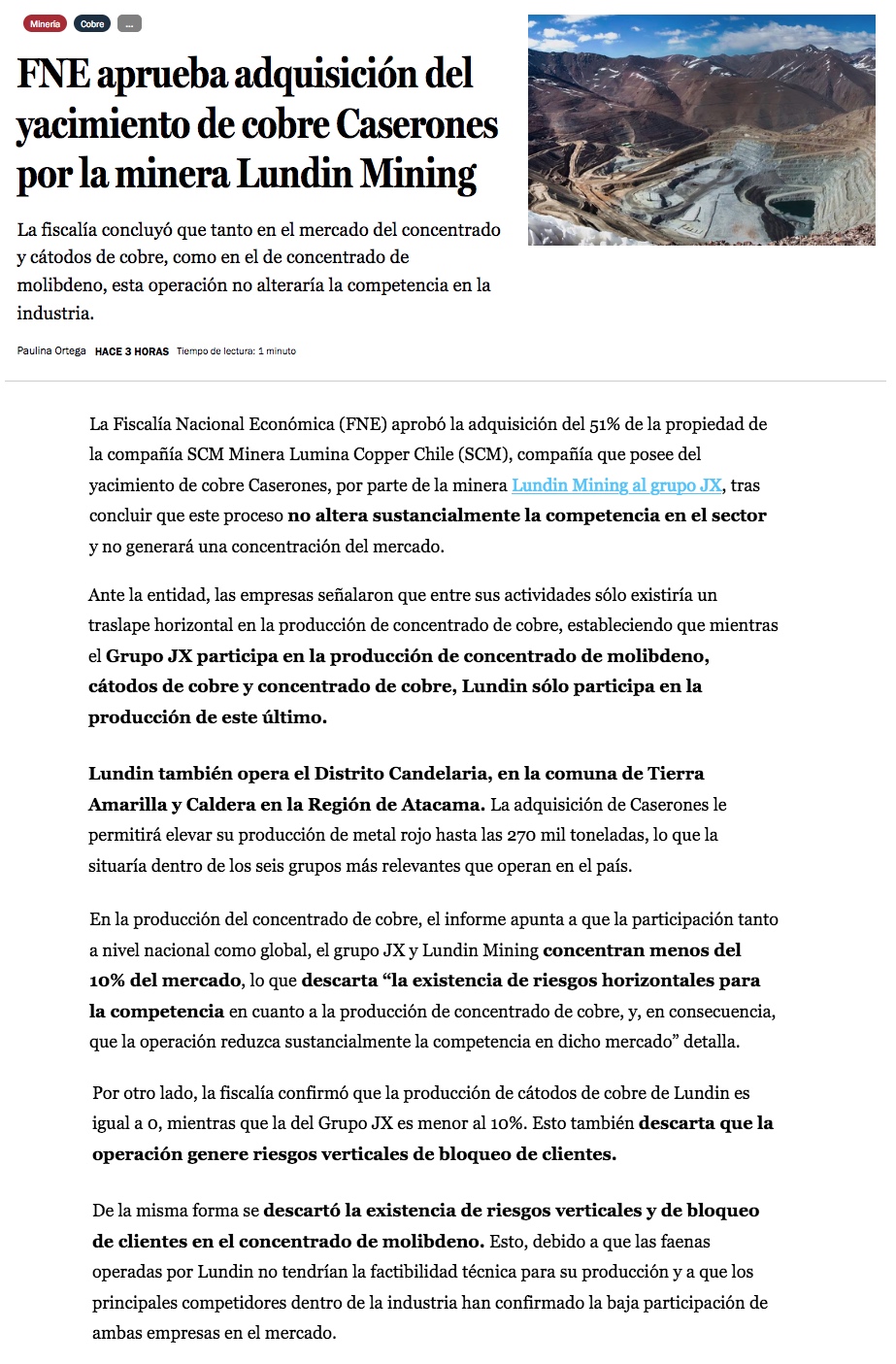 FNE da luz verde a Lundin para tomar control de Caserones - (El Mercurio de Santiago)