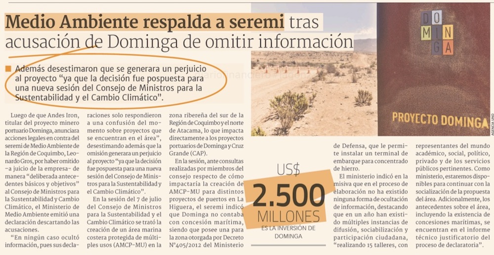 Ministerio de Medio Ambiente replica a Andes Iron por Dominga - (Pulso)