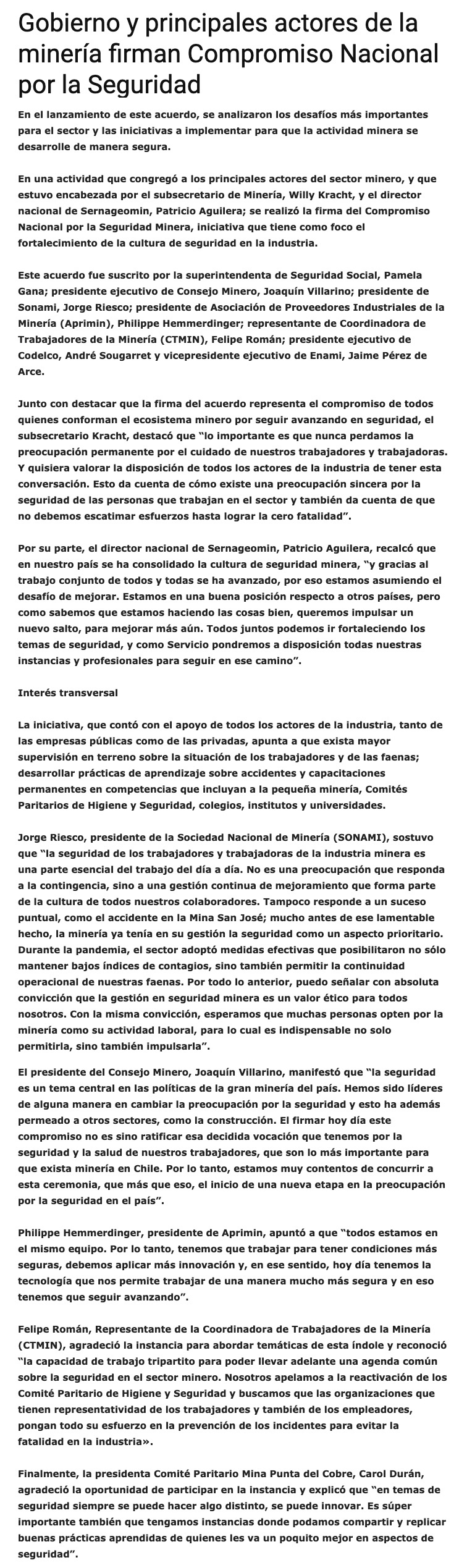 Gobierno y principales actores de la minería firman Compromiso Nacional por la Seguridad - (mvcomunicaciones.cl)