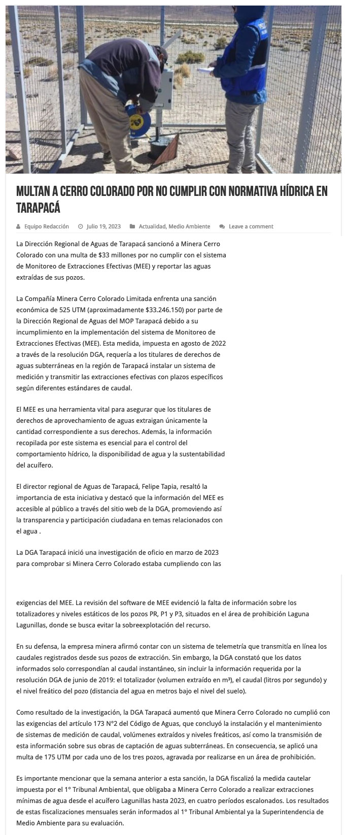 DGA Tarapacá aplica multa de $ 33 millones a Cerro Colorado - (El Longino de Iquique)