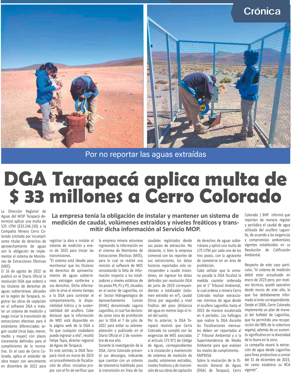 Multan a Cerro Colorado por no cumplir con normativa hídrica en Tarapacá - (chileminero.cl)