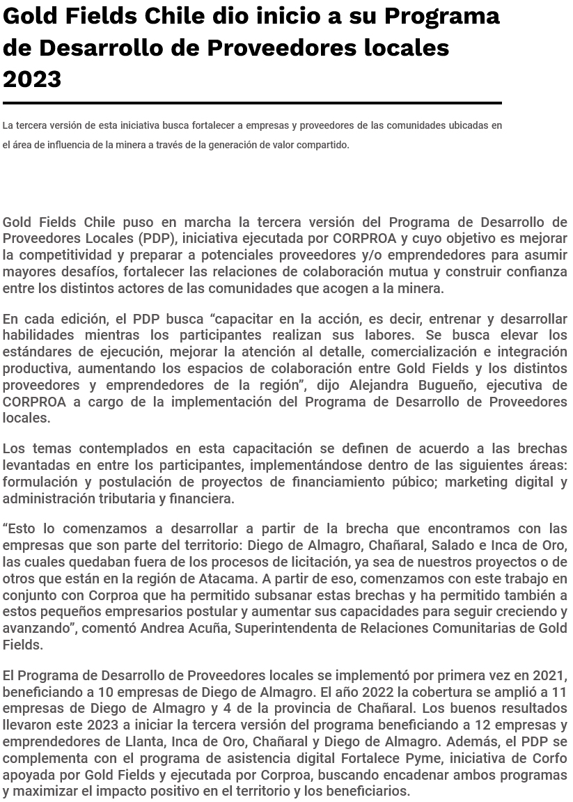 Gold Fields Chile inicia su Programa de Desarrollo de Proveedores Locales 2023 - (mch.cl)