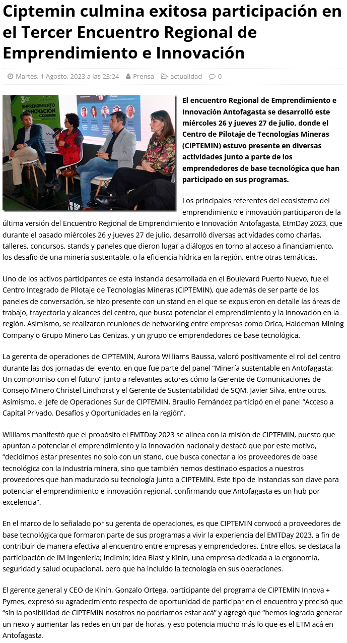 Ciptemin culmina exitosa participación en el tercer encuentro regional de emprendimiento e innovación - (portalinnova.cl)