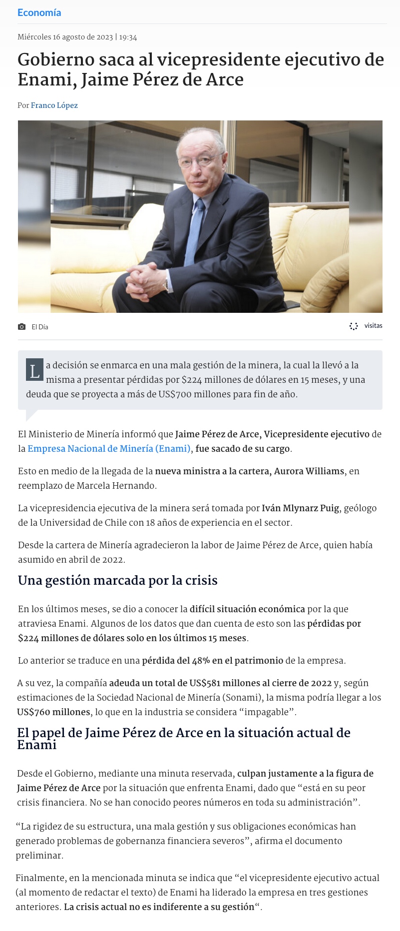 Presidente Boric busca desarticular conflicto removiendo a Jaime Pérez de Arce - (El Mercurio de Santiago)