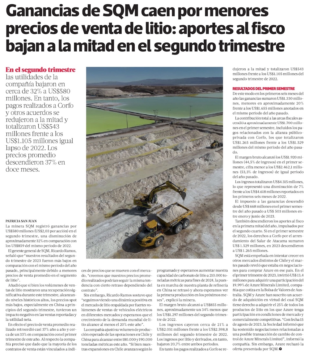 Utilidades de SQM caen 32% por menor precio del litio en segundo trimestre - (El Mercurio de Santiago)