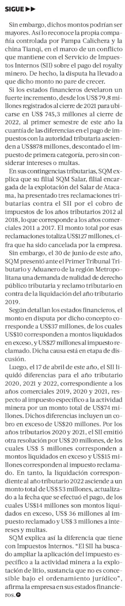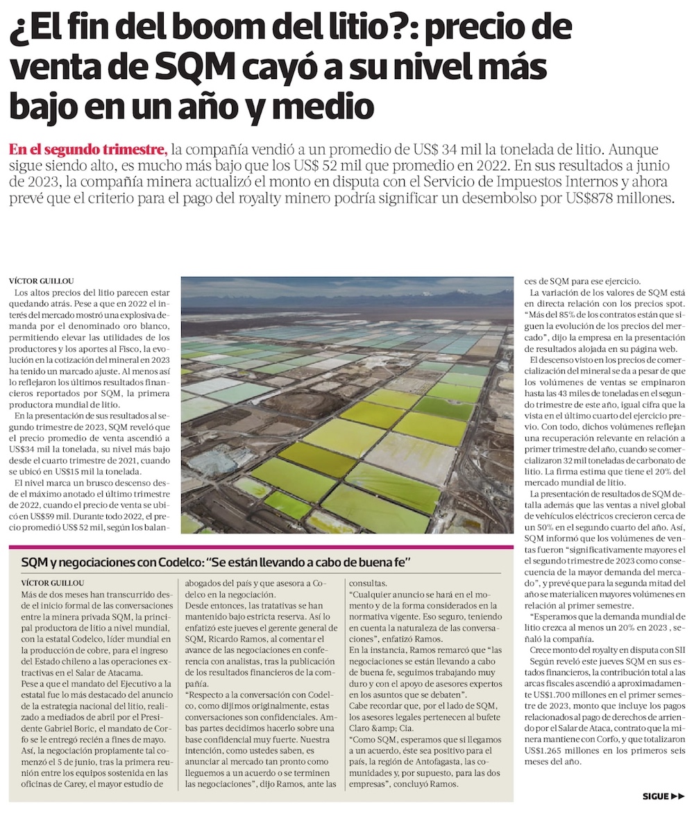 Menores resultados de SQM por precio del litio reducirían aportes a arcas fiscales - (El Mercurio de Santiago)
