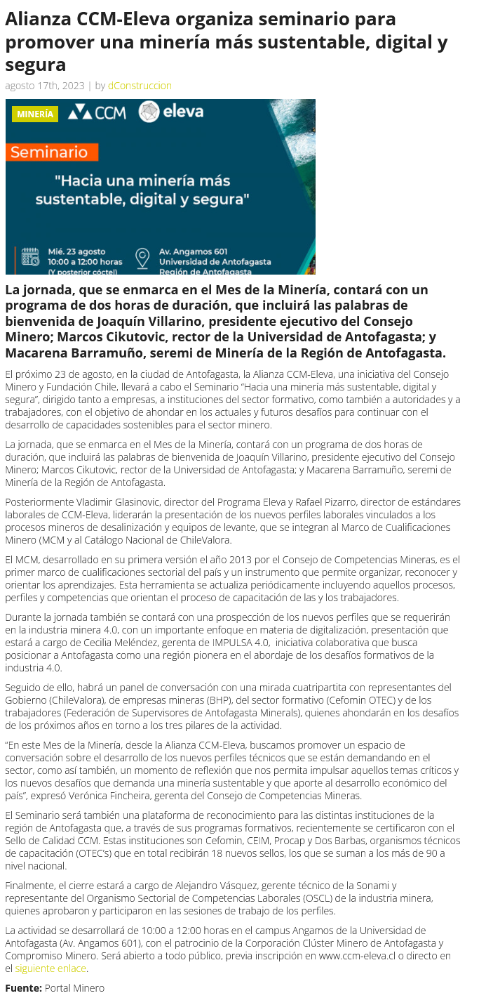 Alianza CCM-ELEVA organiza seminario para promover una minería más sustentable, digital y segura - (tourinnovacion.cl)